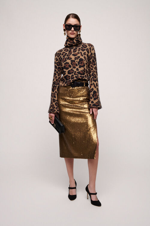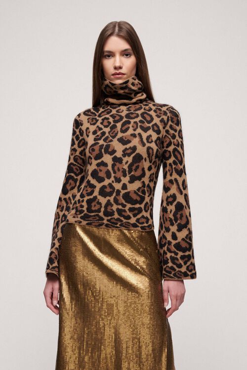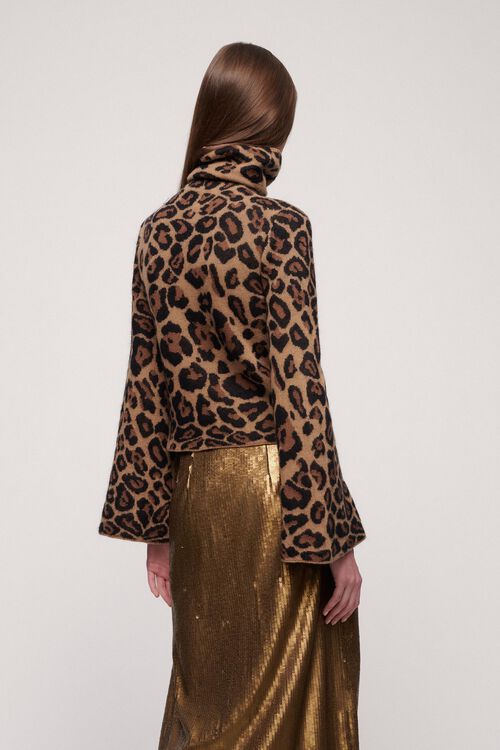 Pulover din lana si casmir, cu guler inalt si maneci evazate, cu imprimeu animal print