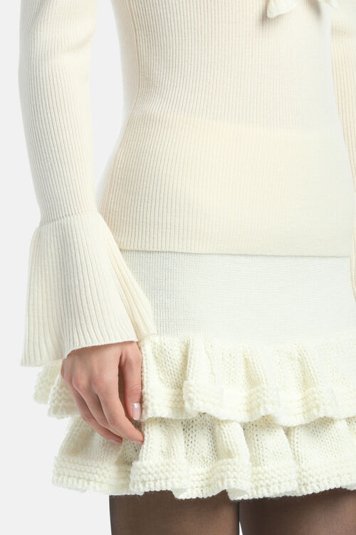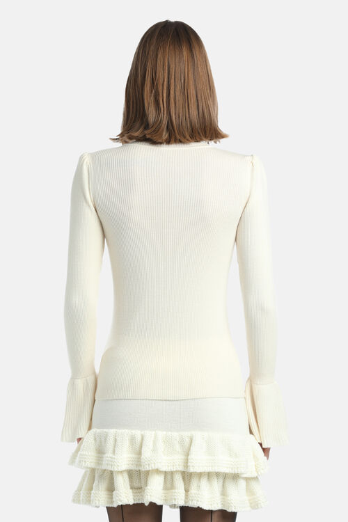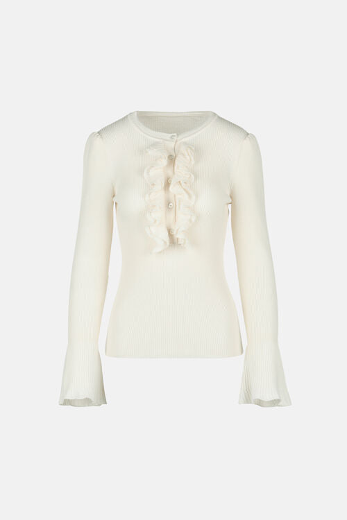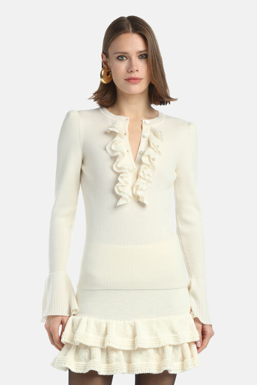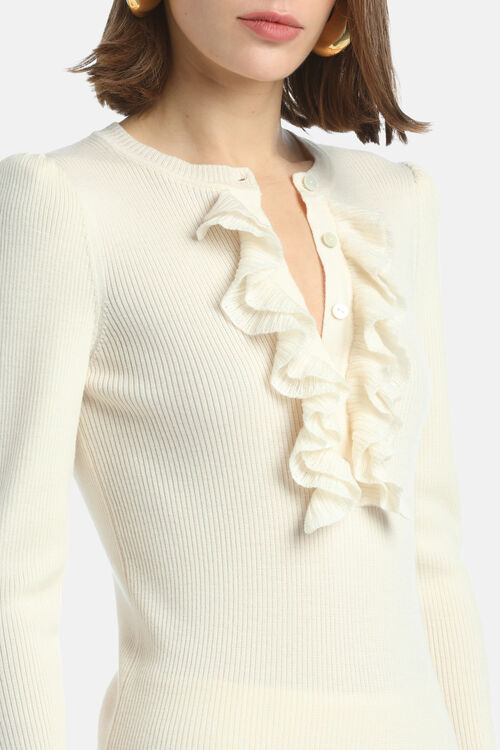 Pulover din lana pura raiata, guler rotund cu deschidere din nasturi, si volane decorative pe langa nasturi.